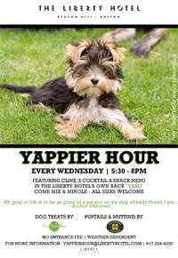 You can't get any better than enjoying happy hour with the one that loves you the most. Your dog. If you don't have one, borrow your neighbors or a friends, and go to Clink at Liberty Hotel. Held every Wednesday. 5:30pm - 8:30pm. All sizes are welcome.