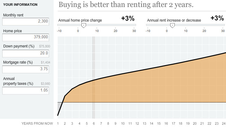$1441 + $495+$333= $2269 per month to buy vs. $2300 per month to rent