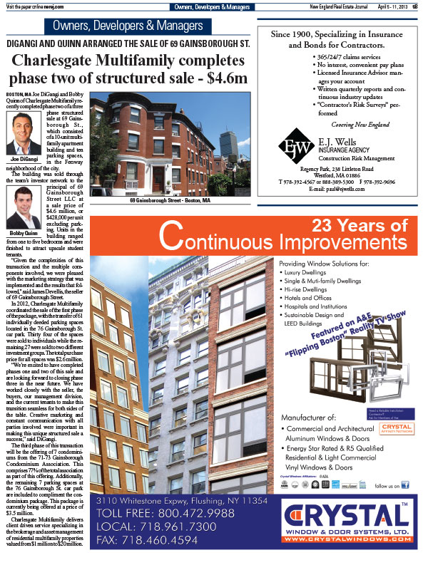 With the sale of 69 Gainsborough Street in Boston’s Fenway, Charlesgate Multifamily received a write up in the most recent issue of NEREJ – published April 5. You can see the entire article below which discusses how Quinn and DiGangi coordinated this $4.6 Million Sale. Great job guys!