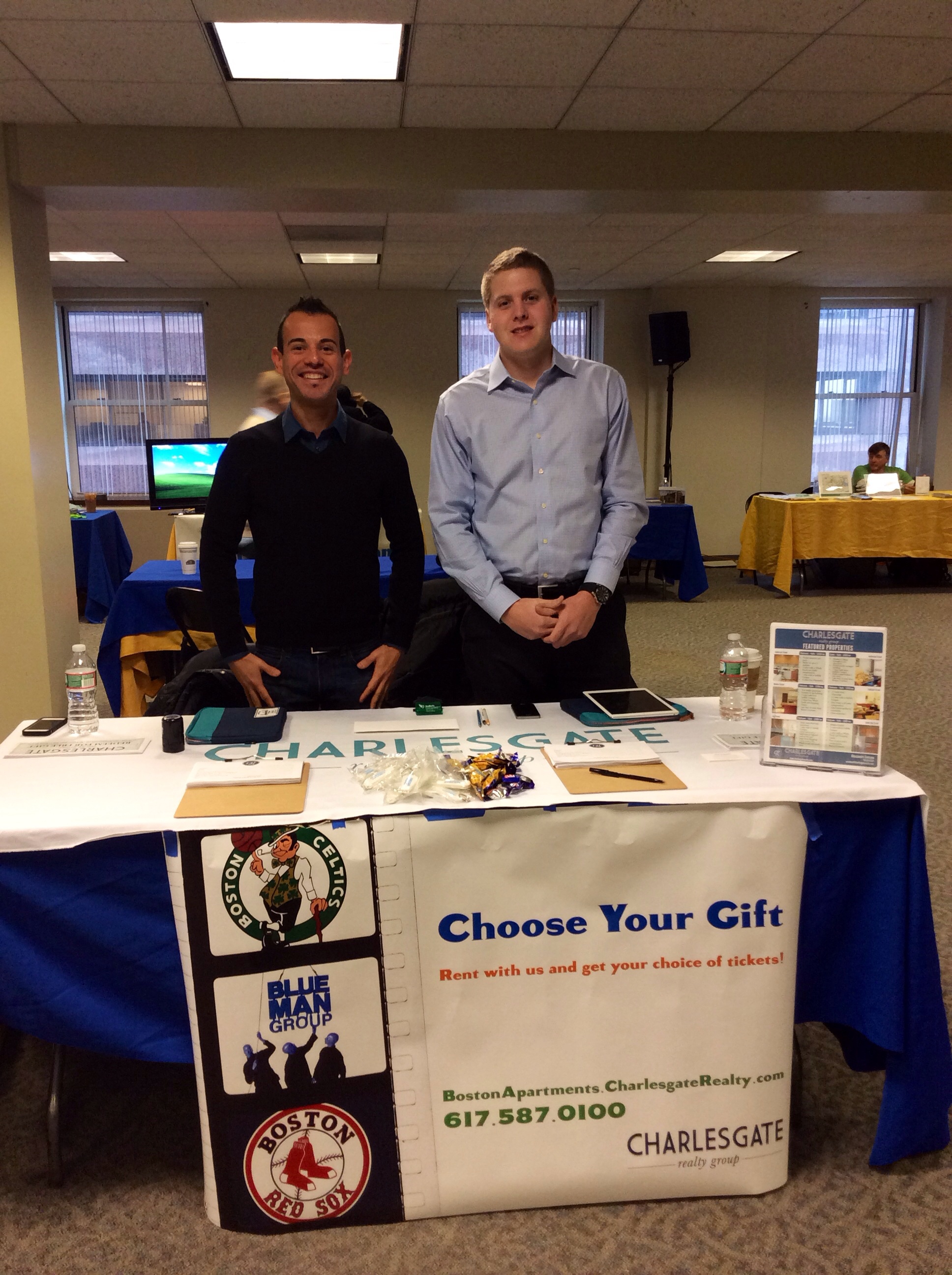 As Jake Downey put it, “Participating in the College housing fairs brought back bitter sweet memories of my college days. Most of the students were very friendly and knew the Boston rental market pretty well. Our Apple TV was a big hit for the raffle prize, and a new incentive Charlesgate adopted (Pick your choice of tickets to the Redsox, Celtics, or Blue Man Group) turned a lot of heads and set us apart from the competition. It’s always difficult  for a business to stand out at any type of fair or show, but thanks to early preparation and planning, the Charlesgate team rose to the occasion. Thanks to BU, Suffolk, and Northeastern for a well organized event! We will be back next year”