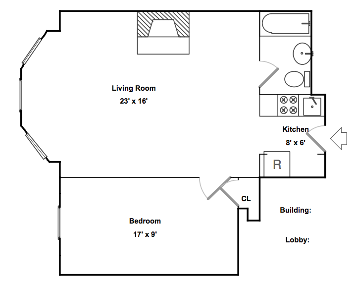 As you can see, the living space is a huge area – creating lots of options for layout and decorating. The bedroom is also a nice size and can fit a queen size bed as well as other comforts. The kitchen and bathroom areas are ready for your custom touches.
