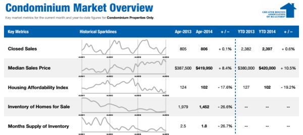 With the release of the newest market reports from the Greater Boston Association of Realtors, we see very little change from previous months in most of the data. New listings were down a bit over 5% for single families and a bit over 10% for condominiums. It is no surprise that supply is still tight in the Boston real estate market. Although we have seen a fairly significant growth in job creation over the first quarter of 2014, it has not resulted in significant changes in the Boston housing market as of yet.