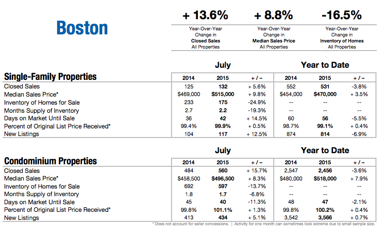 The most recent market reports were just released and showed some exciting movements in the Boston real estate market. According to July sales, condo owners in Boston received 1.1% MORE than list price on average. To go along with this, we saw an increase in average sales price of more than 8% to $496,500.
