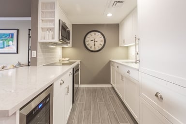 - Fully equipped kitchen with newer custom cabinetry, quartz countertops/breakfast bar, and sleek tiled backsplash