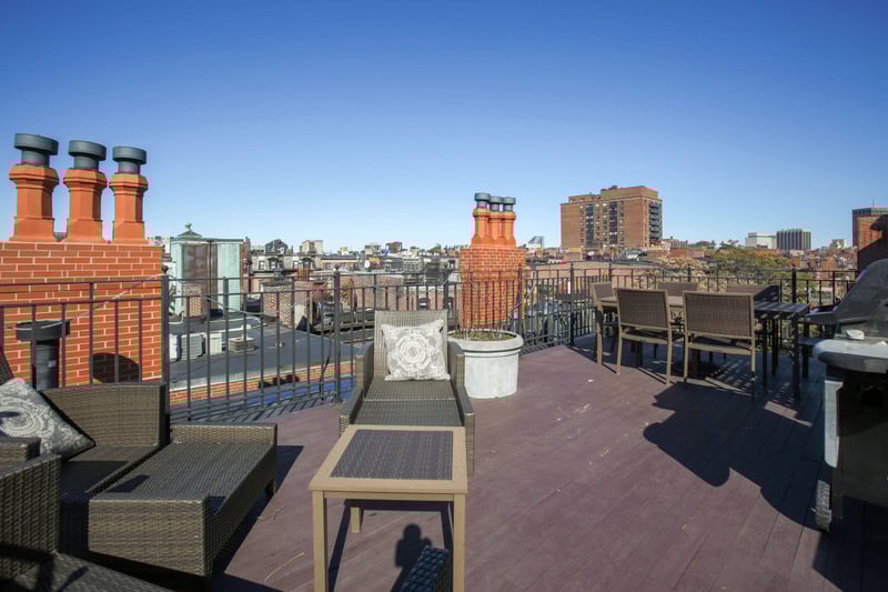 Four bedroom plus den, three and a half bath with direct elevator access and parking. This professionally managed four unit corner building features three exposures from 20+ windows. Also featured are a gracious marble foyer, expansive living and dining rooms with gas fireplaces and a plethora of architectural details including crown moldings and hardwood floors throughout. The custom eat-in kitchen features custom cabinetry, stone counters, Sub-Zero over-sized refrigerator, Uline wine fridge, Viking double oven and a Dacor gas cook-top. The den comes with custom built-ins including surround sound home media system, epic private roof deck installed by the best wood decking company with amazing views of Back Bay, Downtown Boston and Charles River equipped with water spigot, electricity and gas on the deck for entertaining. Included with the unit are two parking spaces.