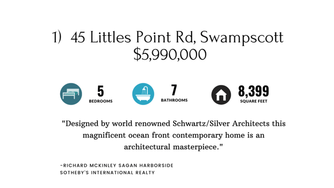 Located only 15 miles north of Boston, you will find an architectural masterpiece with panoramic views of the sky and ocean. Most notable is the dramatic wall of curved windows spanning the entire length of the home allowing for a breathtaking panorama. The 1.4 acres of beautiful landscape sits on top of a rocky promontory overlooking the crashing waves of the Atlantic Ocean. Surrounded by walking trails, a park, and the local beach, you’re destined to find the ultimate relaxation retreat on Littles Point in Swampscott.