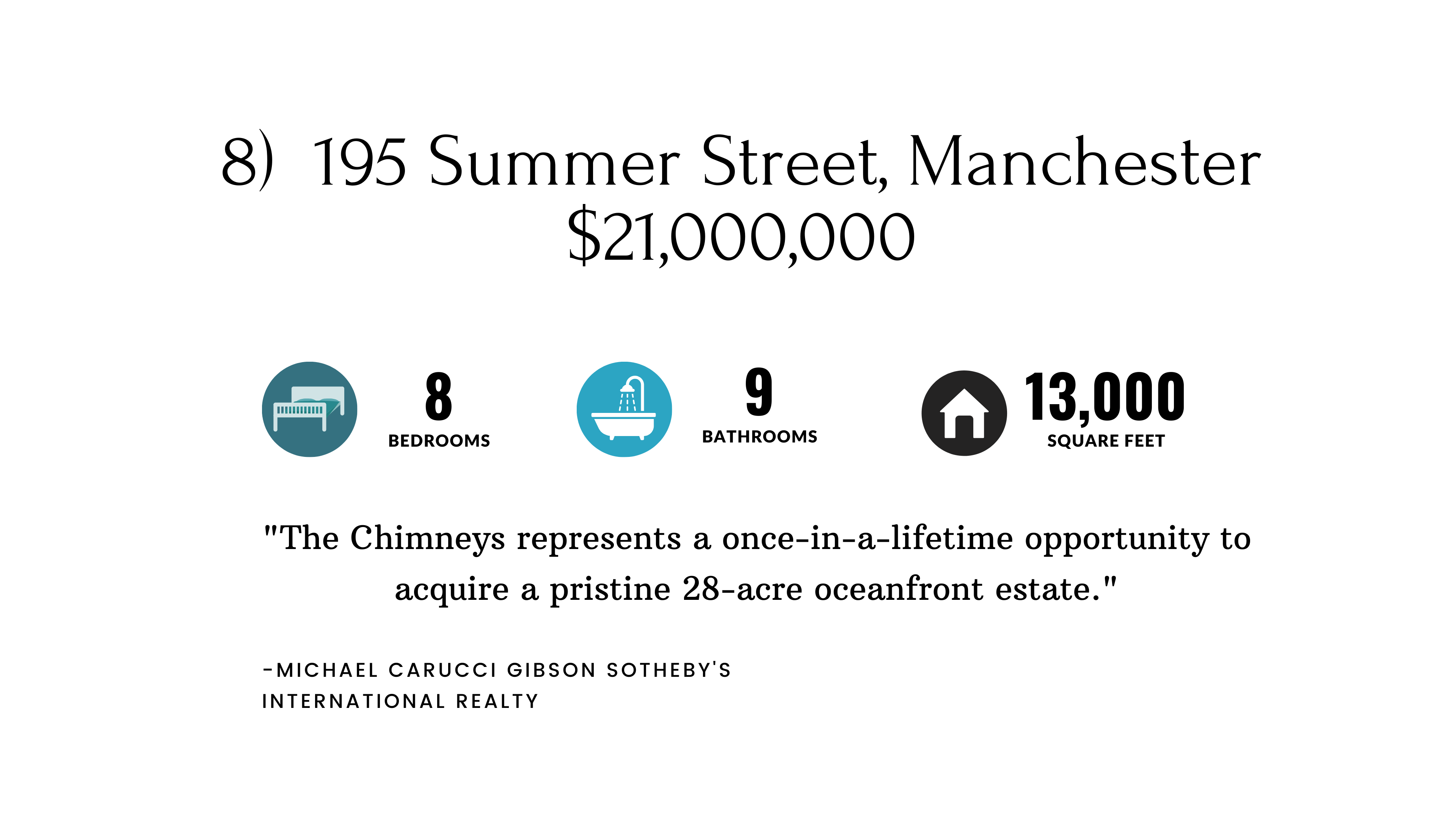 The Chimneys in Manchester-By-The-Sea is so rich with history, it really should belong in its own category. For 175 years, only 3 families have lived at the estate. Named by a previous owner for its seven tall brick chimneys, the estate has been distinguished by incredible standout features: 28 acres, 12 fireplaces, 22 rooms, 4,000-square-foot carriage house, 3,000-bottle wine cellar, one greenhouse, and one private beach.