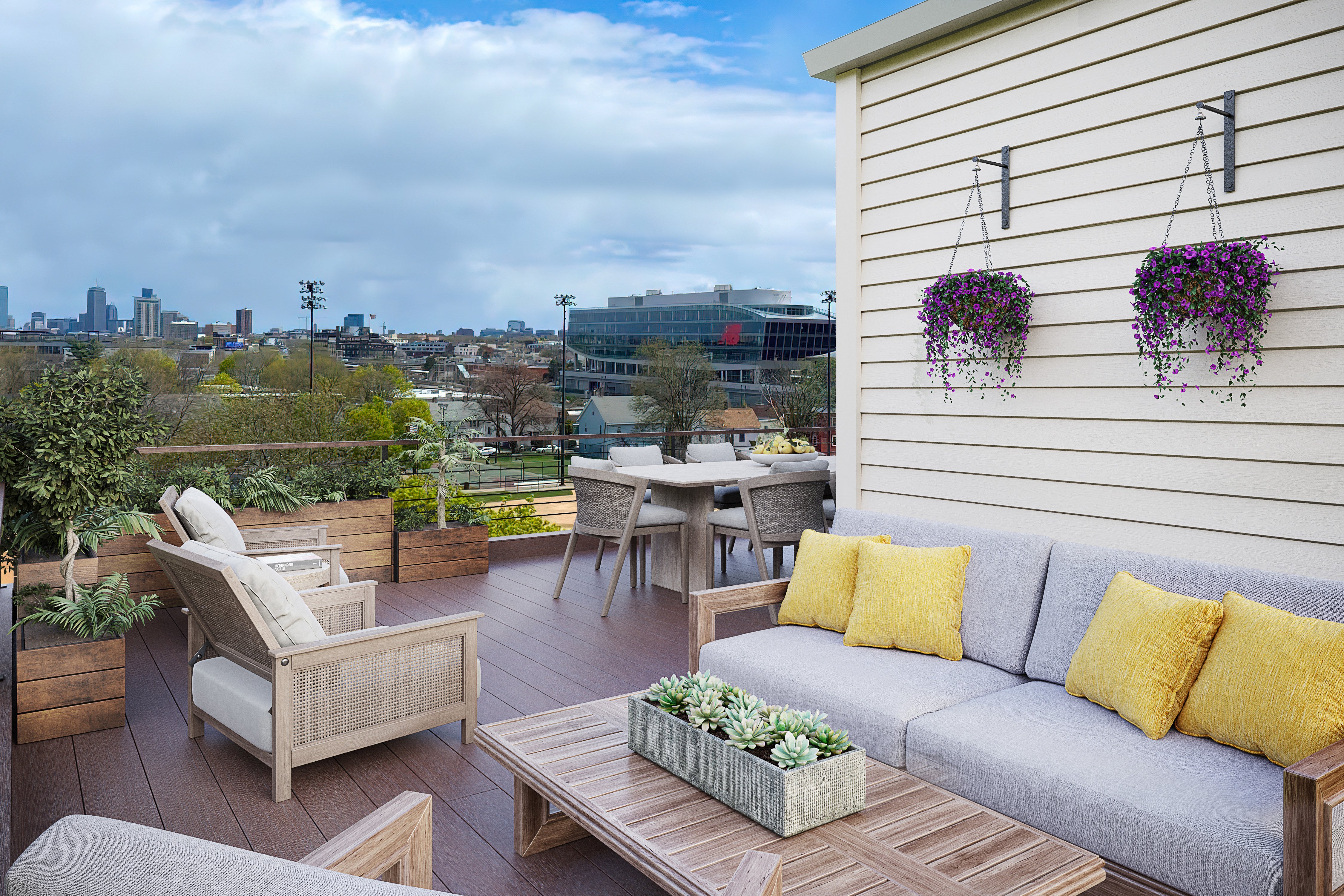 Show-stopping roof deck with an outdoor kitchen showcasing breathtaking views of the city and Charles River.