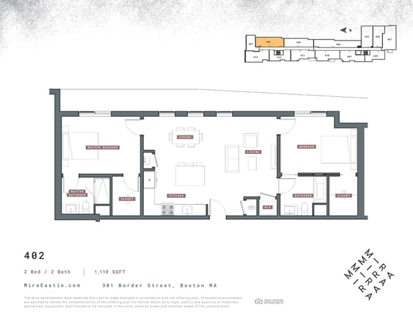 Unit 402 showcases the spacious layouts of our two bedroom units with two bathrooms. It features the high end style-forward designer finishes that MIRA is known for in the kitchen and baths, while providing plenty of spacious living and dining space. Early risers will feel inspired when the sun spills into the bedrooms and living area of 402 at sunrise.
