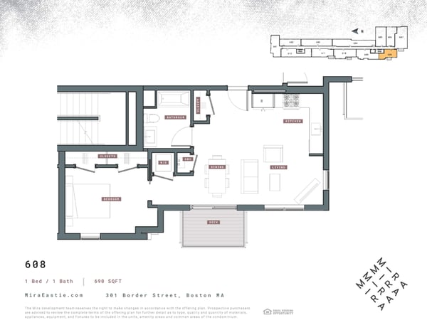 Finally, unit 608 showcases a perfect one bedroom layout. With a deck to hang out on and an inviting open living space, there's plenty of room to host friends. And like any other unit in MIRA, it has ample closet space and the same high end style-forward design.